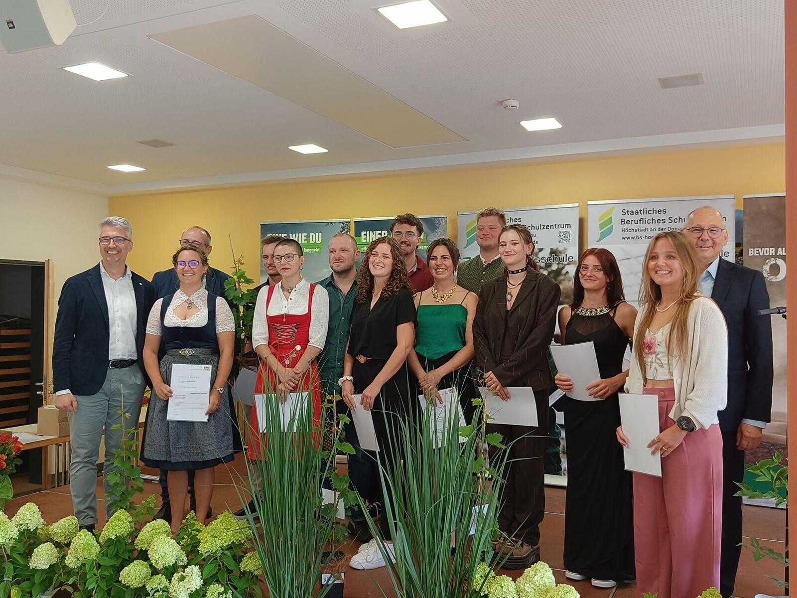 v.l.n.r.: Manfred Bäuml und Andreas Rabisch mit den für hervorragende Leistungen in der Berufsschule ausgezeichneten Schülerinnen und Schülern Emilia Regina Strobel, Felix Kanefzky, Laura Wild Fuchs, Felix Conrad, Theresa Frodl, Julian Lohner, Anna-Lena Hohl, Christian Meiler, Angélique Herrmann, Anna Wengler und Kimberly Otlowski gemeinsam mit Schulleiter Gerhard Weiß