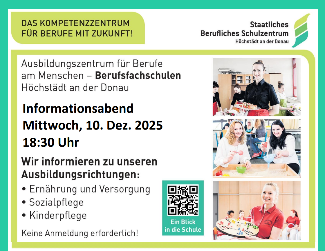 am Mittwoch, den 10.12.25, findet ab 17 Uhr der Elternsprechtag für die Berufsfachschulen Ernährung und Versorgung, Kinderpflege und Sozialpflege statt. Eine schriftliche Einladung sowie eine Mitteilung über den Leistungsstand Ihres Kindes erhalten Sie Ende November noch schriftlich.