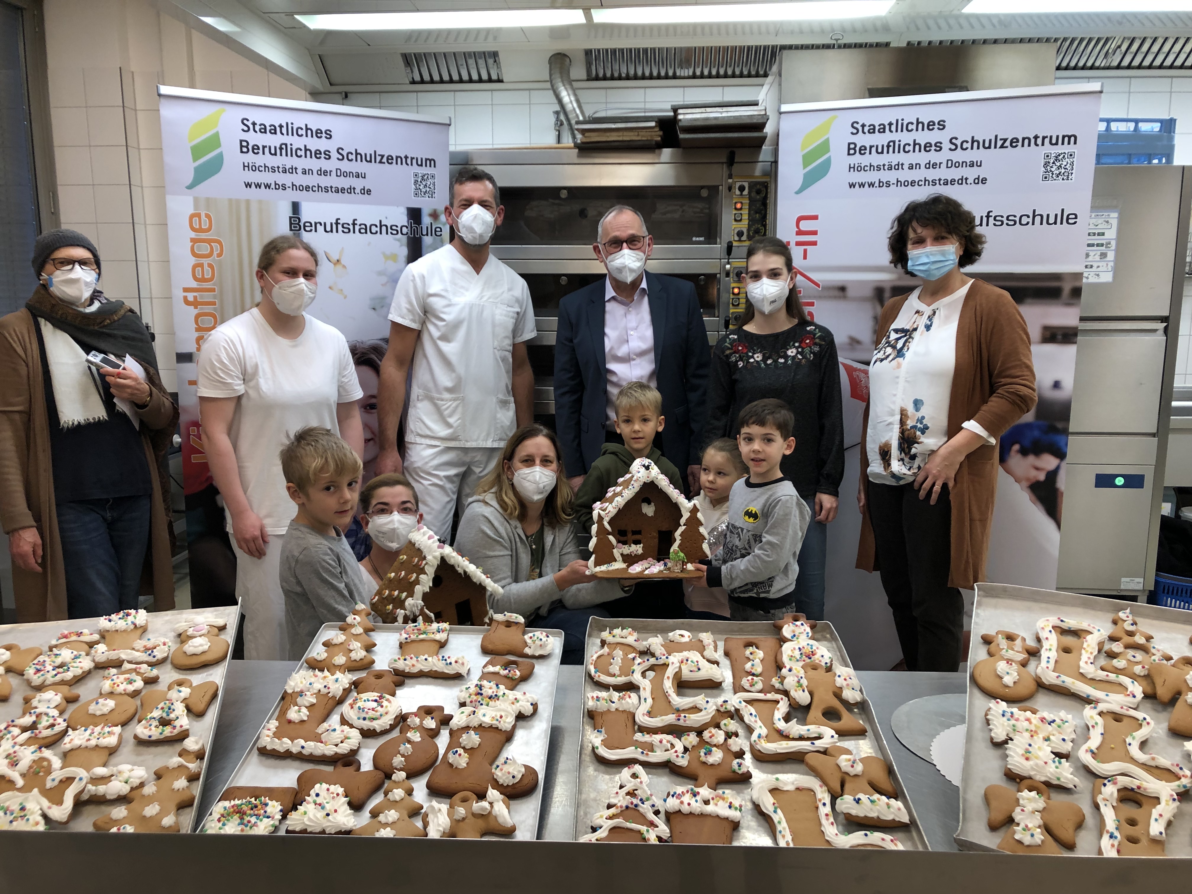 Kindergartenleiterin Bianca Kaltenegger besuchte die Schule mit der Berufsfachschulpraktikantin Jennifer Sandtner und vier Kindern zur Überreichung der Lebkuchenhäuschen. Im Beisein der Fachbetreuerin für Nahrung, Barbara Forster und der Fachbetreuerin für Kinderpflege Veronika Gerstmeyr-Praßler, sowie Schüler*innen der Bäckerklasse und Herrn Mack erfolgte die Übergabe.