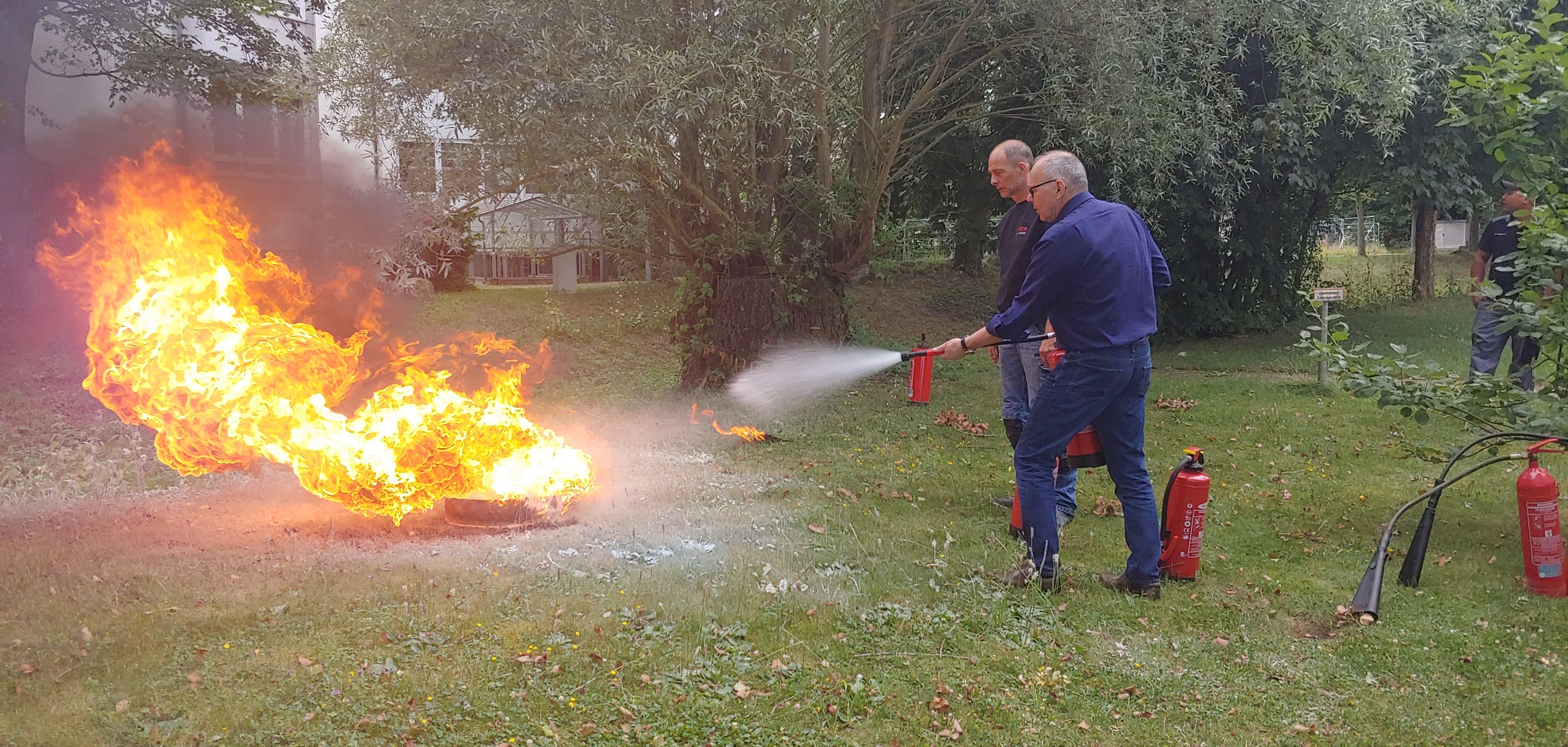 Nach dem Wolfgang Rieder von der Firma „Rieder Feuerschutz“ theoretisch die verschiedenen Feuerlöscher erklärt hat, ging es praktisch ans Werk – unter kontrollierten Bedingungen wurde ein Feuer gezündet und jeder Teilnehmer durfte nun jeweils mit einem Pulver-, CO2- und Schaumlöscher antreten.