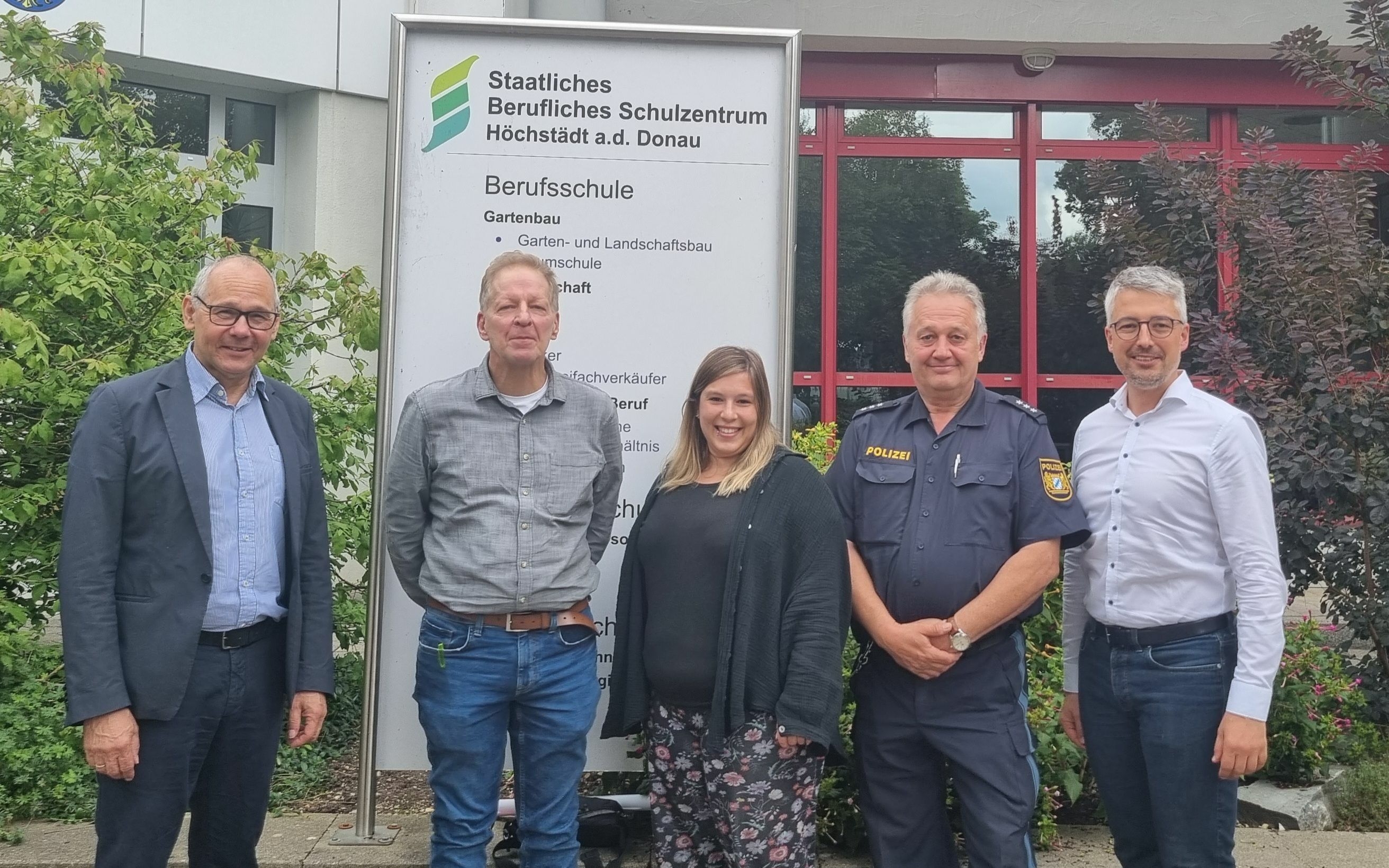 Das bayerische Kultusministerium hat die Teilnahme unserer Schule am Projekt "Prävention im Team" (PIT) genehmigt. Um die nun möglichen Veranstaltungen und Maßnahmen rund um soziale Kompetenzen, Persönlichkeitsbildung, Wissensvermittlung und Lebensgestaltung zeitnah umsetzen zu können, trafen sich am 13. September 2023 zu einem ersten Vorbereitungsgespräch am Staatlichen Beruflichen Schulzentrum der Schulleiter Gerhard Weiß, Beratungslehrer Konrad Lindner, Sozialpädagogin Sandra Weinmann von der St. Gregor Jugendhilfe, Hauptkommissar Robert Drechsler von der Polizeiinspektion Dillingen und der stellvertretende Schulleiter Manfred Bäuml (im Bild v.l.n.r).
