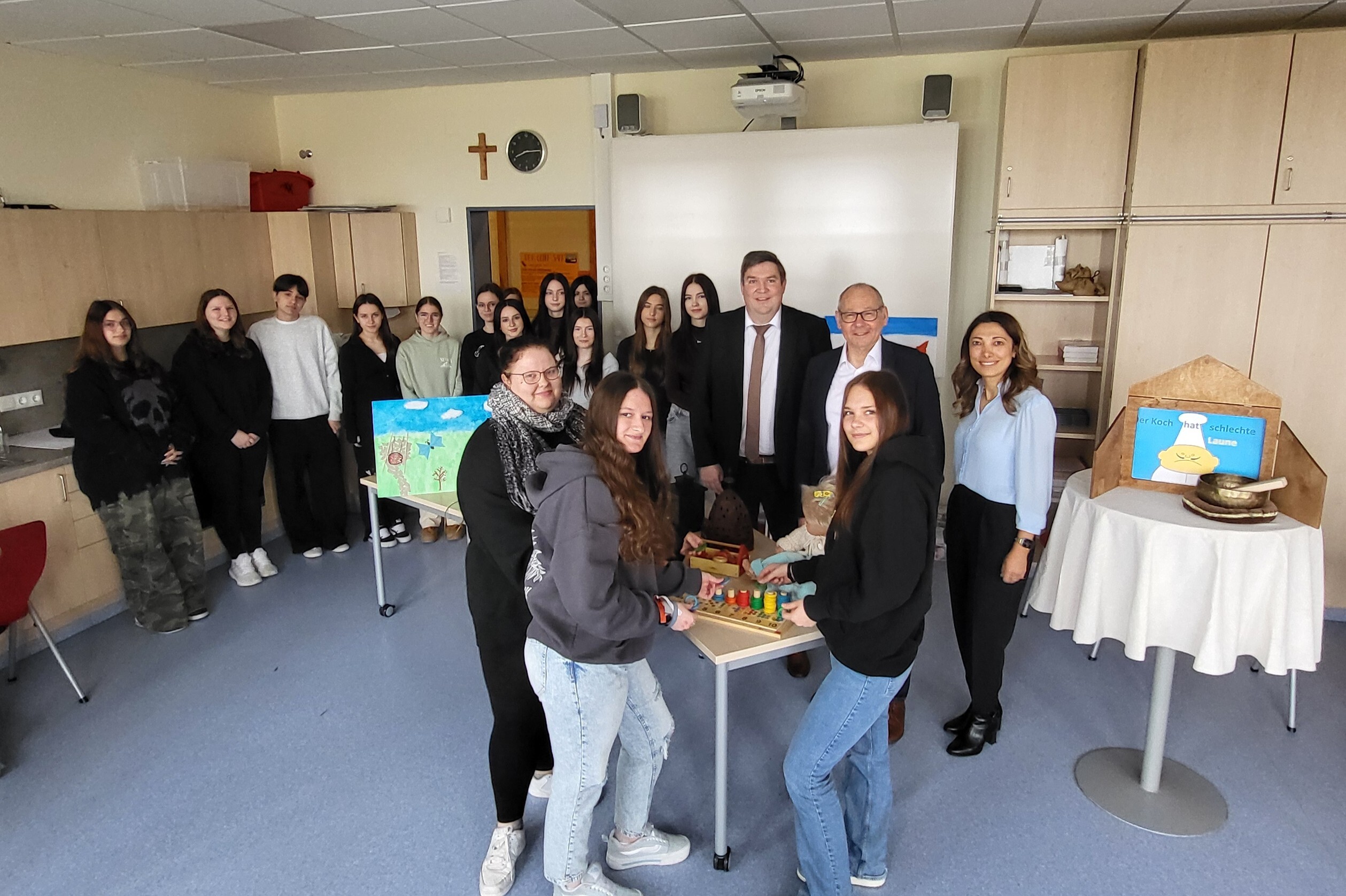 Bild Julia Bronnhuber, Berufsschule Höchstädt: Sona Klein, Fachbetreuerin Kinderpflege, Gerhard Weiß, Schulleiter und Markus Müller, Landrat, mit Schülerinnen der Berufsfachschule für Kinderpflege