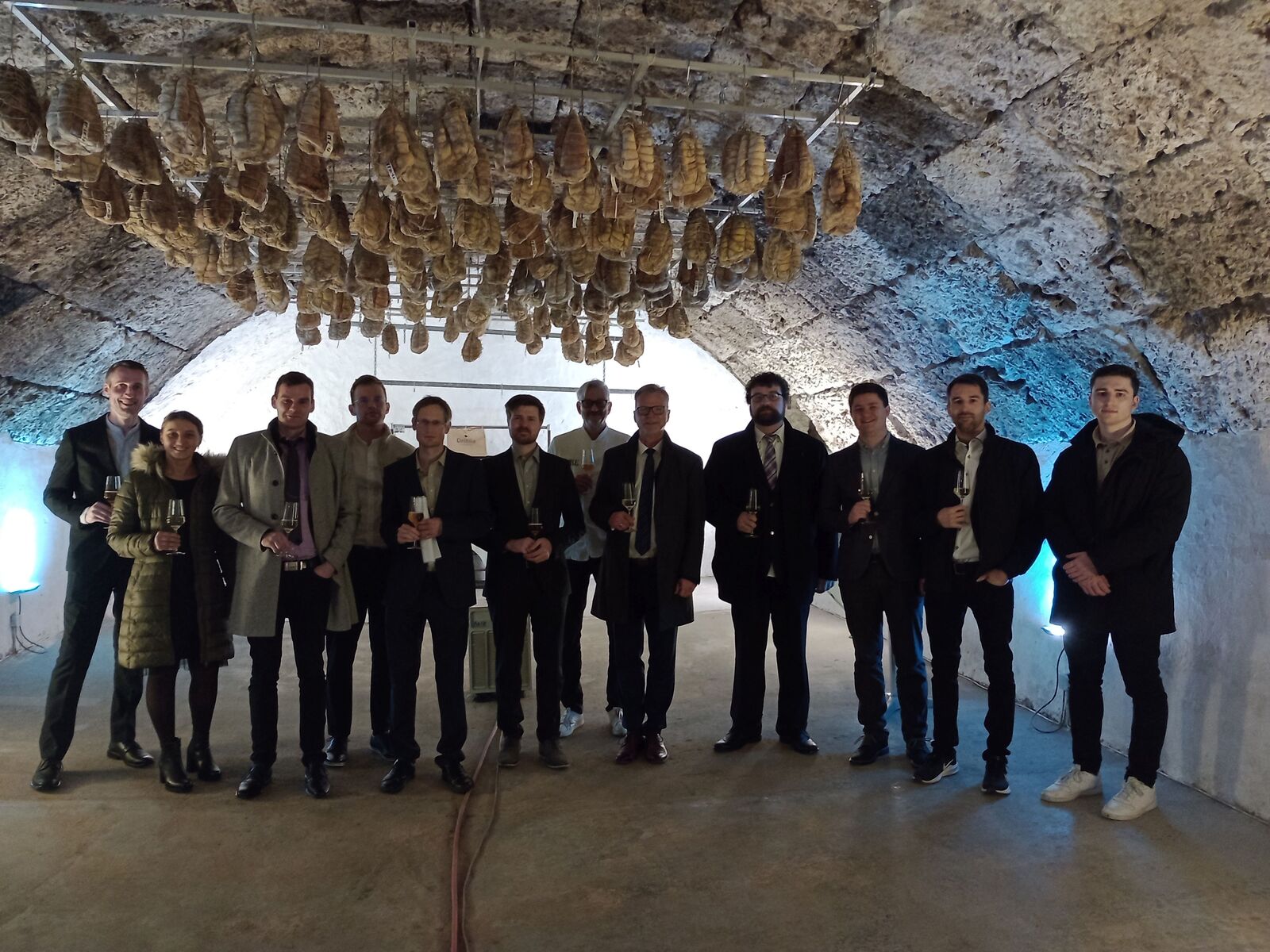 Begrüßt wurden wir dort vom Inhaber im Reife- und Weinkeller (siehe Bild oben) bei Culatello-Schinken, der über ein Jahr lang reift, sowie mit Sardinen gefüllte Oliven. Dabei gewannen wir einen ersten Eindruck eines traditionellen, aber sich dennoch immer wieder neu erfindenden Sterne-Restaurant. Bei einem 3-Gänge-Menü, untermalt mit einem Rollenspiel, wurden wir mit Fischsuppe, Rehkeule sowie einem Bananen-Eis-Dessert verwöhnt und bekamen die Zutaten und Zubereitung ausführlich erklärt.