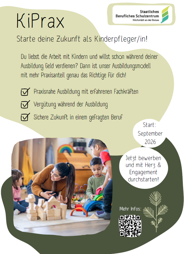 Wir nehmen am Schulversuch KiPrax teil. Mit KiPrax soll die Kinderpflegeausbildung insbesondere durch einen größeren Praxisanteil modernisiert werden. Die klassische Kinderpflegeausbildung bleibt erhalten.