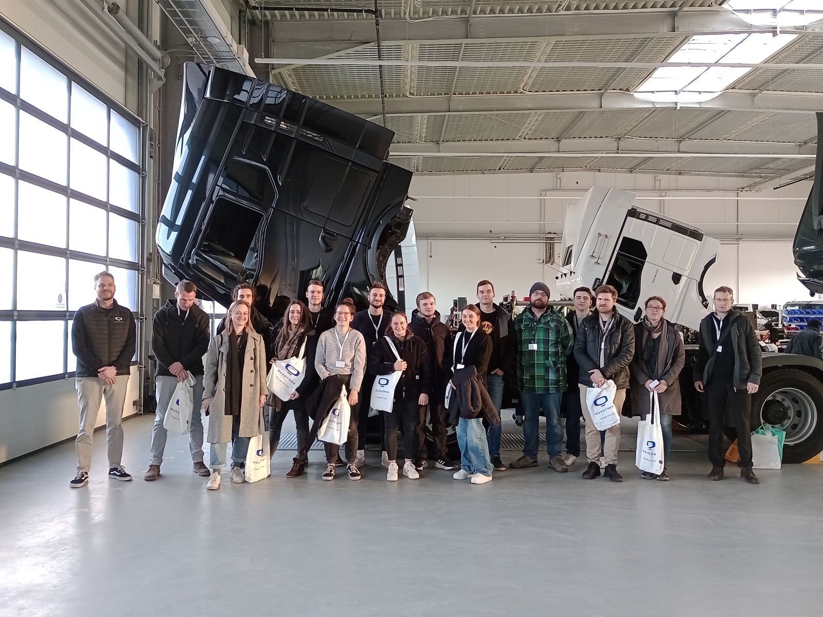 Beim Ortstermin in Gersthofen am 5. Februar 2024 informierten sich die angehenden Technikerinnen und Techniker aus Höchstädt über das Geschäftsmodell des Wasserstoff- und E-Mobilitätsspezialisten Quantron. Zum Full-Service-Angebot gehören insgesondere die Umrüstung von Gebraucht-Nutzfahrzeugen auf Wasserstoff-Hybrid- (FCEV) oder direkten getriebelosen Elektroantrieb (BEV) im Rahmen eines „Refurbishments“. Aber auch Neufahrzeuge werden auf Kundenwunsch beschafft, umgerüstet und zum Kauf angeboten.